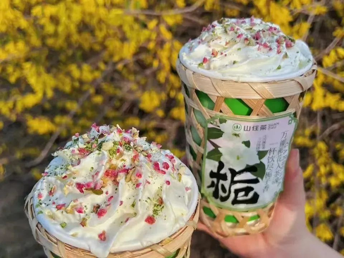 前几天山东品牌山住茶上新的竹篓奶茶,刚上2天就成了排名Top1的单品,创始人崔彪告诉我,在上竹篓奶茶之前,也考虑过竹筒奶茶,但因为这个品类的复购率难以保证,所以最终用竹篓呈现产品。