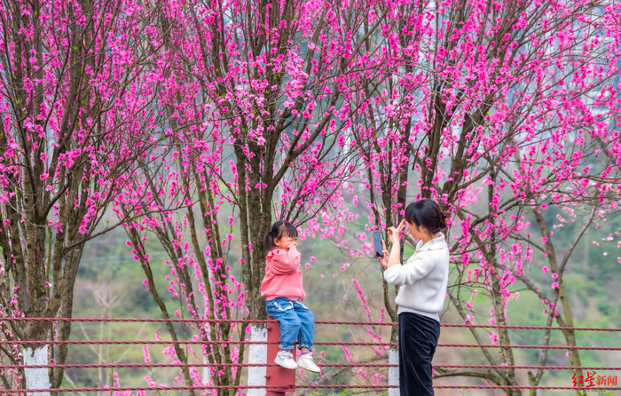3月19日,红星新闻记者在公园环线大半环的红旗塘服务区一带看到,浓淡相间的桃花在枝头簇拥盛放,如同一幅彩色画卷落在山间,游客三五成群,漫步桃花树下,仿佛置身“桃花源”,心生陶醉,不胜欢喜。