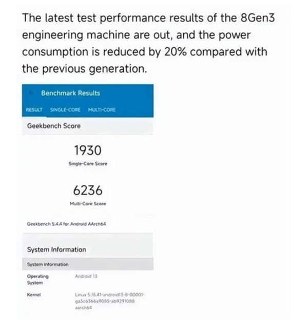 目前已有骁龙8 Gen3性能数据流出,可以看到骁龙8 Gen3的单核跑分为1930,多核6236,相较于骁龙8 Gen 2的单核1524,多核4597均有很大的提升。