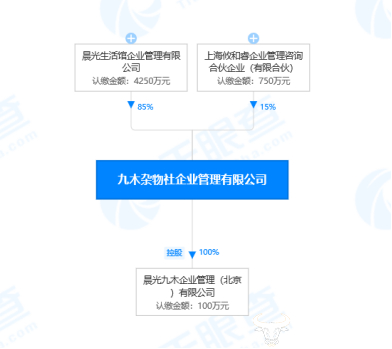 天眼查显示,九木杂物社企业管理有限公司2016年成立,该司由晨光生活馆企业管理有限公司和上海攸和睿企业管理咨询合伙企业(有限合伙)共同持股,其中晨光生活馆企业管理有限公司由上海晨光文具股份有限公司全资持股,也就是说,九木杂物社为上市公司晨光股份(SH:603899)旗下的公司。