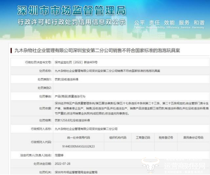 具体来看,据深圳市场监管局网站显示,九木杂物社企业管理有限公司深圳宝安第二分公司日前因销售不符合国家标准的泡泡玩具,被深圳市市场监督管理局宝安监管局罚款1258.8元并没收违法所得。处罚日期为2022年7月28日。