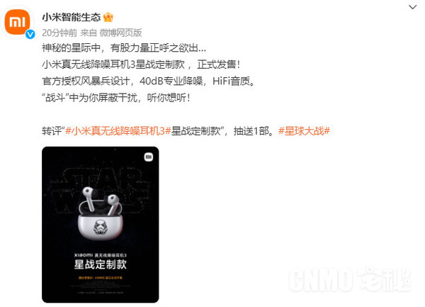 【宅秘新闻】3月20日,小米智能生态官方宣布,小米真无线降噪耳机3星战定制款正式发售,采用官方授权风暴兵设计,支持40dB专业降噪,拥有HiFi音质,售价499元。作为参考,小米真无线降噪耳机标准版之前售价499元,现在到手价为319元。