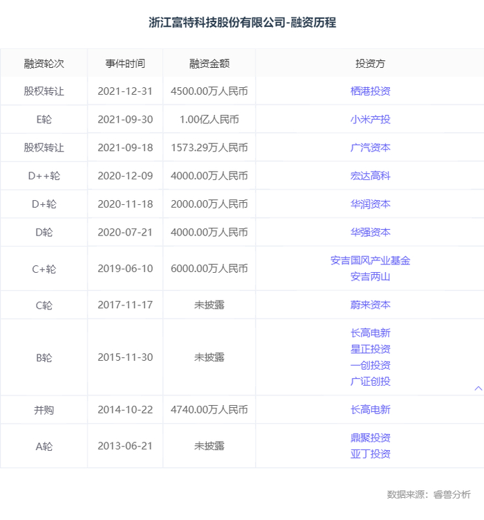 在创业过程中,富特科技也获得了众多知名机构的青睐。据睿兽分析,公司共完成7轮融资,包括蔚来资本、华润资本、长高集团、宏达高科、华强资本等机构。