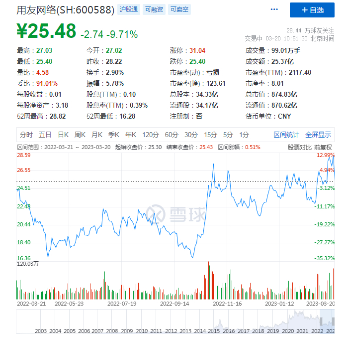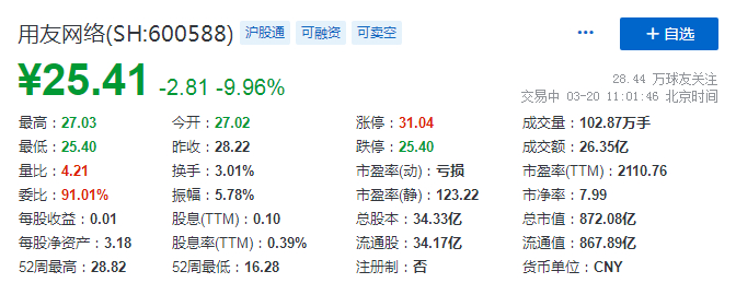 蓝鲸TMT频道3月20日讯,用友网络今日股价大跌,盘中一度触及跌停。截至发稿,用友网络股价报25.41元/股,总市值872.08亿元。