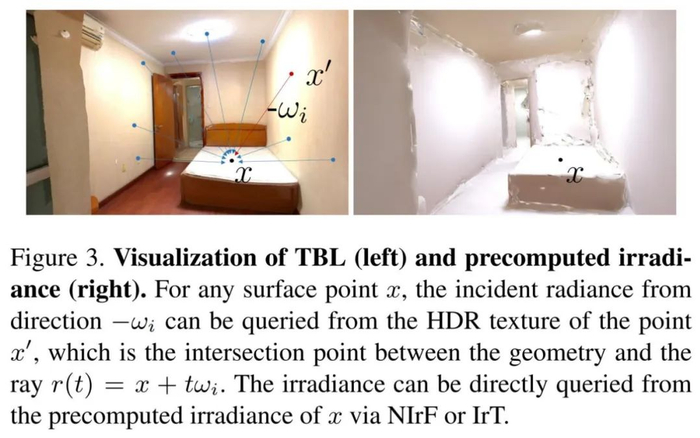 如视使用自研的高质量三维重建技术来重建整个大场景的网格模型。最终基于输入的 HDR 图像来重建 HDR 纹理,并通过 HDR 纹理从任意位置任意方向查询全局光照。下图 3(左)展示了 TBL 的可视化。