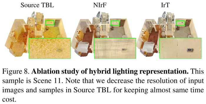 其次验证混合光照表示的有效性,将混合光照表示与原始 TBL 进行比较,结果如下图 8 所示。如果没有混合光照表示,反照率会导致噪声并且收敛变慢。预计算辐照度的引入可以使用高分辨率输入来恢复精细的材质,并大大加速优化过程。同时与 NIrF 相比,IrT 产生了更精细和无伪影的反照率。