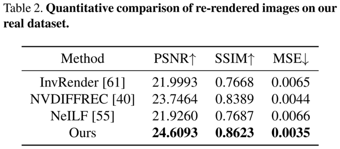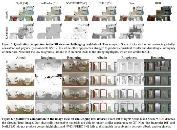 接着在包含复杂材质和光照的挑战性真实数据集上进行评估,下表 2 的定量比较结果显示出如视方法优于以往方法。尽管这些方法具有近似的重渲染误差,但仅有如视方法解耦了全局一致和物理合理的材质。