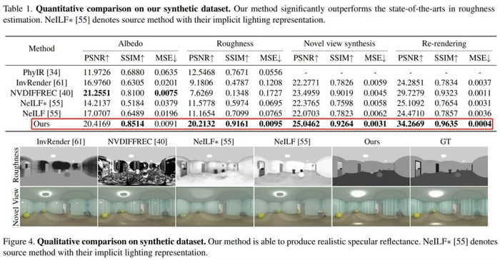 首先来看合成数据集上的评估,如下表 1 和图 4 所示,如视方法在粗糙度估计方面显著优于 SOTA 方法,并且该粗糙度可以产生物理合理的镜面反射率。此外相较于原来的隐式表示,具有如视混合光照表示的 NeILF 减少了材质与光照之间的模糊性。