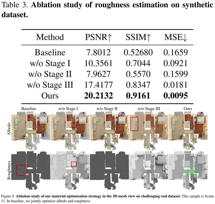 最后对三阶段式策略的有效性进行了验证,结果如下表 3 和图 9 所示。基线粗糙度未能收敛且仅高光区域得到更新。第一阶段如果没有反照率初始化,则高光区域反照过亮并导致不正确的粗糙度。第二阶段基于 VHL 的采样和基于语义的传播,对于恢复未观察到镜面反射高光区域的合理粗糙度至关重要。第三阶段基于分割的微调产生了精细的反照率,使得最终的粗糙度更平滑,并阻止了不同材质之间粗糙度的错误传播。