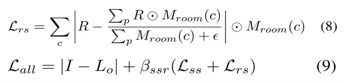 第三阶段基于分割的微调。如视基于语义分割和房间分割先验来微调所有的材质纹理。具体地,如视使用了与公式 (4) 类似的平滑约束以及用于粗糙度的房间平滑约束,使不同房间的粗糙度变得更柔和、平滑。房间平滑约束由公式 (8) 定义,同时不对反照率使用任何平滑约束,总损失被定义公式 (9) 所示。