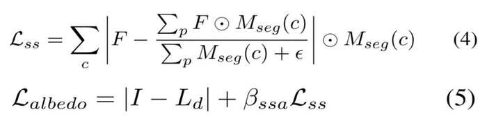 第一阶段基于 Lambertian 假设来优化稀疏反照率,而不像以物体为中心的小场景那样将反照率初始化为常数。虽然可以通过公式 (3) 直接计算漫反射反照率,但在高光区域会使得反照过亮,导致下一阶段的粗糙度过高。因此,如视使用语义平滑约束在相同的语义分割上激发类似的反照率,如下公式 (4) 所示。稀疏的反照率通过公式 (5) 来优化。