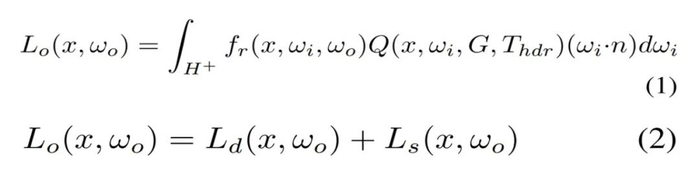 在实践中,直接利用 TBL 优化材质存在弊端,蒙特卡洛高采样数会导致很高的计算和内存成本。由于大多数噪声存在于漫反射分量,如视对漫反射分量表面点的辐照度进行预计算。因此可以高效地查询辐照度,取代了成本高昂的在线计算,如图 3(右)所示。基于 TBL 的渲染方程由公式 (1) 重新写为公式 (2)。