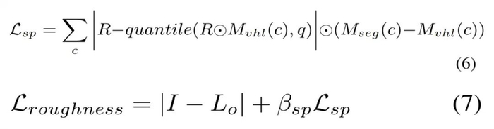 如视首先基于粗糙度为 0.01 的输入姿态来渲染图像以找到每个语义类的 VHL 区域,然后根据冻结的稀疏反照率和光照来优化这些 VHL 的粗糙度。合理的粗糙度可以通过公式 (6) 传播到相同的语义分割中,并且该粗糙度可以通过公式 (7) 进行优化。