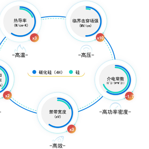 碳化硅作为宽禁带半导体的代表性材料之一,其材料本征特性与硅材料相比具有诸多优势。以现阶段最适合用于做功率半导体的4H型碳化硅材料为例,其禁带宽度是硅材料的3倍,热导率是硅材料的3倍,电子饱和漂移速率是硅的2倍,临界击穿场强更是硅的10倍。在硅基半导体器件性能已经进入瓶颈期时,碳化硅材料的优异特性让它成为了下一代功率半导体器件的理想原材料。