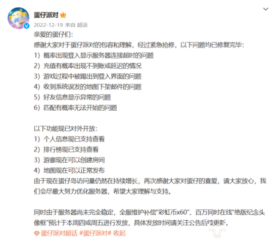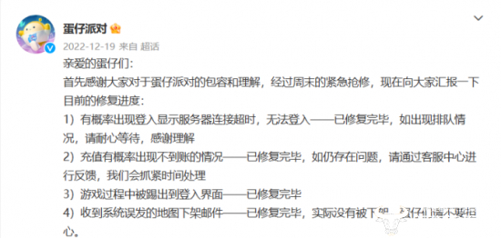 而后,在12月19日《蛋仔派对》官博发文汇报修复进度,表示相关问题已修复完成,并表示将持续投入人力继续优化服务器。
