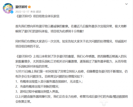 据了解,2022年12月中旬,《蛋仔派对》因其多次出现服务器异常问题,引发玩家不满,对此,12月17日,《蛋仔派对》官方微博发布“《蛋仔派对》项目组致全体玩家信”,信中表示,在最近几日服务器多次出现异常,极大地影响到了玩家的游玩体验,项目组为此感到十分抱歉,并提出针对服务器异常,官方将全服发放补偿。