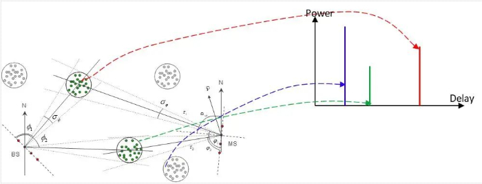 传统的2D 信道建模(时延,衰落功率)如图3种右侧所示从时间和功率两个维度的对信道进行了刻画。在大规模天线系统中不同天线单元具有不同的空间位置和极化方向,无线信号经过信道中不同反射簇(cluster)到达每个天线单元的信号具有不同的空间特性(到达角度,离开角度,角度扩展等)。对多天线系统而言除了信道的时域、频率选择性之外,信道的空间特性也成为系统设计和性能评估的重要因素。