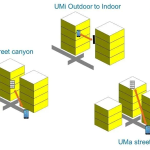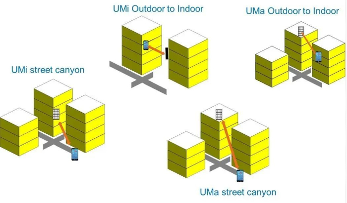 从3G时代开始多天线技术已经在蜂窝及短距离通信等各种无线通信标准中得到广泛应用。LTE和 LTE -Advanced定义了TM1 – TM9九种传输模式 (Transport Mode) 。其中TM2 – TM9对应不同类型的多天线技术,最多支持8天线8流数据传输。Release 13中增加了full dimension (FD)-MIMO,CSI-RS 端口数从8增加到16并引入了垂直方向的波束赋形。实际网络中基站和不同终端用户的天线往往处于 不同的高度 ,图1 列出了几种3GPP TS38.901标准中基站和终端的位置关系。垂直方向的波束赋形可以使波形具有更强的方向性,垂直方向上的波束分离使基站可以同时服务多个终端且保证终端之间的干扰为最小(图2)。