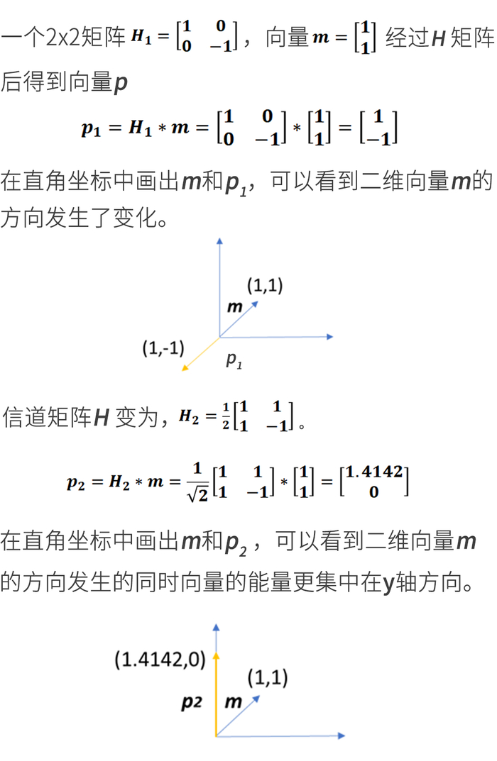 在MIMO系统多个天线对之间空间信道也是有方向和能量的。模拟域的波束赋形通过调节天线阵列中不同天线单元间信号相位和幅度使得天线的方向具有指向性。基带的预编码处理相对模拟波束赋形理解起来要抽象很多,我们通过一个例子来了解下。