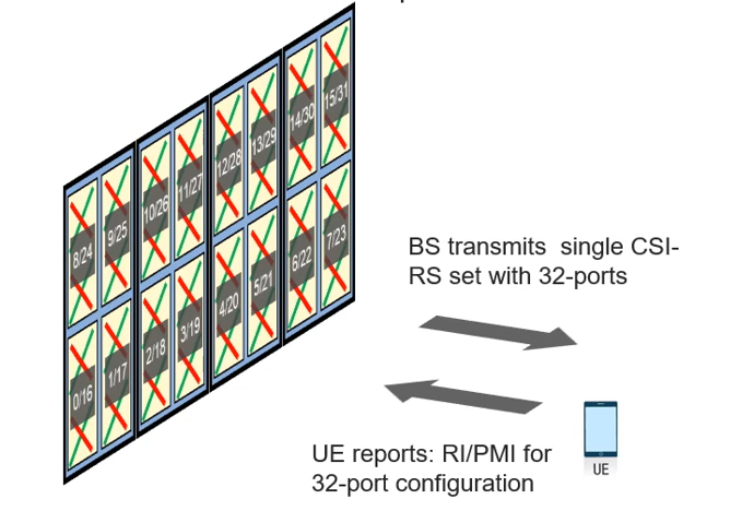 3GPP TS 36.879文档给出了FD-MIMO两种射频链路到物理天线的映射关系。图6是第一种为sub-array partition模式,在这一模式下物理天线被分成多个组,每个TXRU都连接到其中一个组。CSI-RS 天线端口与TXRU一一对应,也成为Non-precoded CSI-RS,该模式下一个CSI-RS资源集(resource set)中CSI-RS的个数一般大于8。图7是Non-precoded CSI-RS 传输模式的示例,NR基站在一个CSI-RS resource set 中分配32个CSI-RS天线端口,终端通过对32个天线端口的CSI-RS进行测量并上报RI/PMI/CQI。
