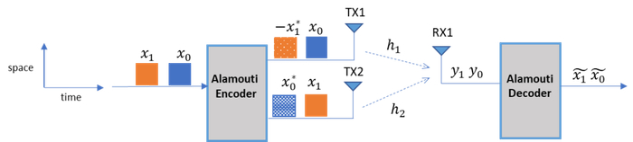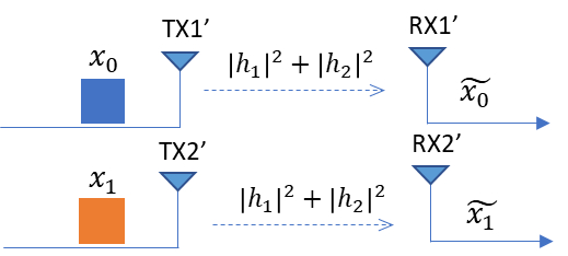 2*1 Alamouti方案将两发一收的无线系统转化为两个SISO信道,且每个SISO的信道增益包含了空间多样性