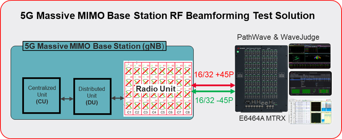 Keysight 最近推出了E6464A/E6416A 多收发射频测试仪 (MTRX) [3][4]。 MTRX是一种可扩展的射频测平台。一台E6464A/E6416A可以提供最多64/16个矢量信号分析仪 (VSA)和64/16个矢量信号发生器 (VSG)。MTRX内置数字预编码和massive MIMO信号加权矩阵功能,同时支持直通连接选项,可以对网络和设备进行端到端波束赋形测试。MTRX中的矢量信号分析还可以通过Keysight Pathwave软件,WaveJudege软件完成或者保存为开放的IQ文件。图11展示了以MTRX硬件为核心的5G Massive MIMO测试解决方案。
