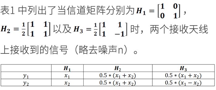 可以相应计算出y1和y2如表2。同样,经过简单的方程计算可以对发射信号x1和x2进行复原。在信道H'3中,我们可以看到从TX1发射的信号x1在TX1 -> RX1这条链路上经过了比H3信道中更深的衰落(h11=0.1)。 但由于TX1 -> RX2这条链路上的信道条件较好(h21=0.9),因此仍可以在接机对x1进行解调和复原。这就是我们经常讲到的MIMO系统可以更好地对抗由多径引起的快衰。一条链路陷入deep fading 不要紧,相同的信号还有在多条其他的链路上传输。大家集体陷入deep fading的概率是相对较小的。