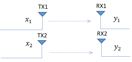 ● 当收发天线之间的信道为对角阵H1的时候,MIMO收发系统可简化为图13。尽管这种情况在实际无线系统中不会出现,但我们可以把它想象为两条直通的有线链路。接收机可以直接通过y1和y2对发射信号x1和x2进行复原。