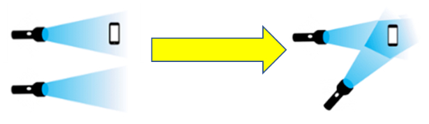 尽管预编码和波束赋型是分别在数字域和模拟域的操作,但两种技术的本质都是试图改变信道的指向,使能量聚集到信号需要进行传输的方向。我们来看一个例子。如果把物理天线看作是手电筒,图5左侧的两个手电筒同时并行照向一个终端。由于下方的手电筒没有对准图中终端的位置,终端几乎接收不到来自下方手电筒的能量。改变下方手电筒的方向,使下方手电筒射出的光更好地指向终端。终端就可以获得更多的能量。