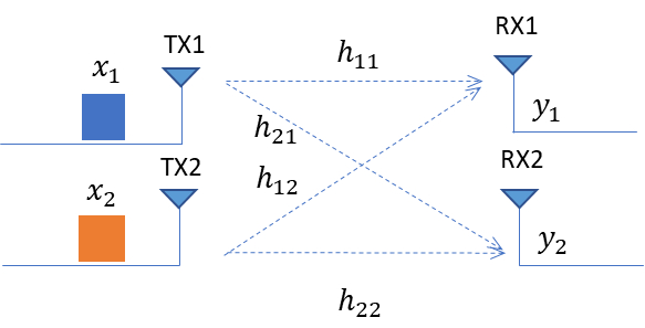 空间复用指的是利用多天线系统的多个发射天线带来进行不同信号的发送。这里我们先不考虑预编码以及波束赋形技术,认为不同天线传输的是来自不同码字(codeword)的数据。以最简单的2*2的空分复用系统为例,先来看下不同信道条件下接收机接收到的信号分别是什么。文中会有一些简答的公式推导,限于篇幅我们会略去详细的参数说明。