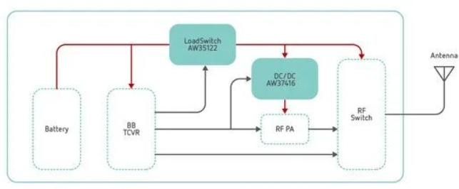 AW37416/37426根据BB给出的控制信号实时调整输出电压,实现APT功率追踪,动态调整PA供电电压,降低不必要的功率损耗,最终实现系统效率最佳化,可参考如下基本应用框图: