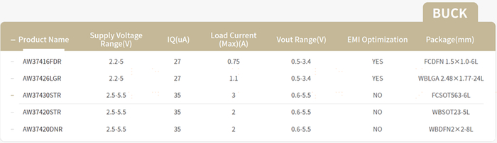 为适配更完善的降压方案,艾为BUCK产品有常规2A/3A输出电流的降压芯片,同时也配备了专给射频PA供电的APT BUCK,其工作电压低、输出电流高成为一大亮点。