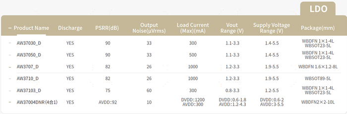 艾为AW37030和AW37050系列具备高PSRR(90db)和低Noise(33uV)的特性,为常规Camera供电带来了福音,多样化的输出电压(1.1V-3.3V)也是其一大亮点。