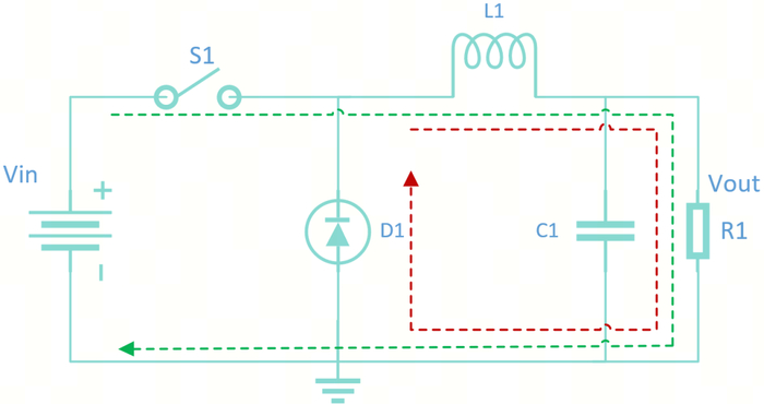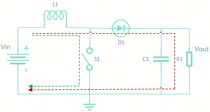 1.当开关S1闭合时,Vin给电感L1充电,见绿色充电路径,电感电流不断增加,加在电感两端的电压是