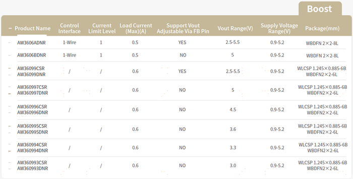 以艾为明星Boost产品AW36099系列为例,其是一款静态电流仅为1uA的高效率超低功耗同步升压转换器。适用于一切采用碱性电池、镍氢电池、锂锰电池、锂亚电池及其它可充电锂离子电池供电的电子设备,特别是对电池使用时间及寿命有较高要求的便携及可穿戴电子设备、各类NB-IoT应用等。