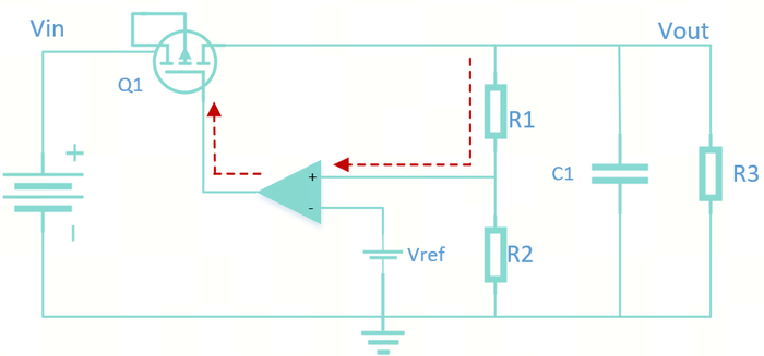 主要工作流程是Vout电压通过分压电阻分压,分得的电压和基准电压Vref进行比较,通过运放比较后,输出的电压来控制PMOS栅极,增加PMOS输出电流,从而提升Vout输出,见如下红色路径: