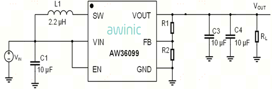 AW36099系列有CSP和DFN两种封装形式,有可调输出版本,同时也有2.5V、3.0V、3.3V、3.6V、4.5V、5.0V固定电压输出版本,方便工程师灵活选择,典型应用电路如下: