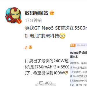 IT之家 3 月 20 日消息,数码博主“数码闲聊站”发文爆料,realme GT Neo5 SE 首次在 5500mAh 超大电池上实现了百瓦闪充方案,还有一个“榨干锂电池”的黑科技。