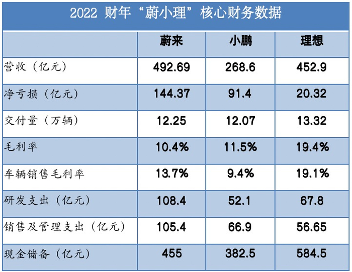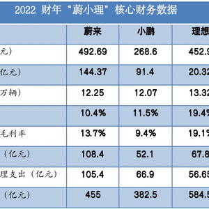 随着小鹏汽车在3月17日晚间发布2022年财报,蔚来(NIO.US/9866.HK)、小鹏汽车(XPEV.US/9868.HK)、理想汽车(LI.NASDAQ/2015.HK)全部交出了2022年成绩单。
