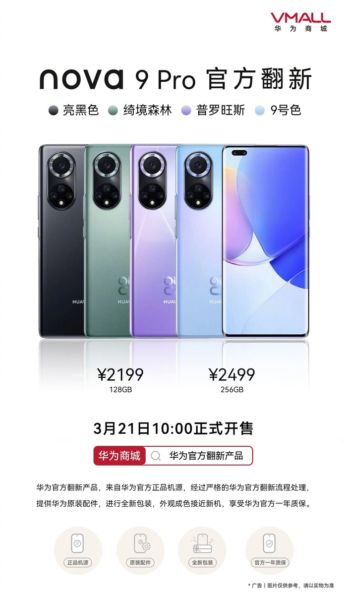 IT之家 3 月 21 日消息,华为官方今日宣布,nova 9 Pro 官方翻新机将于 3 月 21 日 10:00 正式开售,感兴趣的用户可以在华为商城找到这款机型。