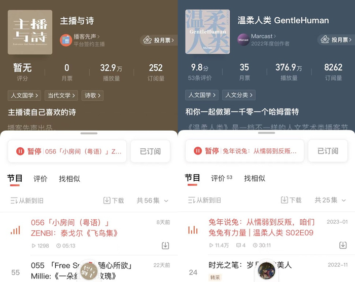 播客《主播与诗》每期邀请一位播客主读一首诗。读出声音的诗歌,有着不同于印在纸张上的美妙,能带给我们心灵的沉静和抚摩,缓和白天奔波起伏的焦虑思绪。由艺术作者 Cher主持的人文艺术播客《温柔人类》,不照本宣科,而是从人们当代生活的角度出发,为听友解读不一样的艺术和历史。