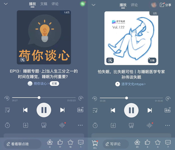 同时,也有播客主在播客节目中直接围绕睡眠话题,邀请医生、心理专业人士等分享可以帮助缓解焦虑、有助睡眠的方法。播客《荷你谈心》在节目《当人生三分之一的时间在睡觉,睡眠为何重要?》中,请到西南大学应用心理学博士文瑞探讨“睡眠的生理机制,睡眠与意识的关系,睡眠质量的评估及对生活的影响等话题”。播客《活字电波》则邀请到睡眠医学专家、北京大学第六医院睡眠医学科主任、《失眠疗愈》的作者孙伟谈失眠话题,为我们厘清失眠的知识和本质,在有了基本的常识之后,我们再去寻找适合自己的方式、求助相应的机构。