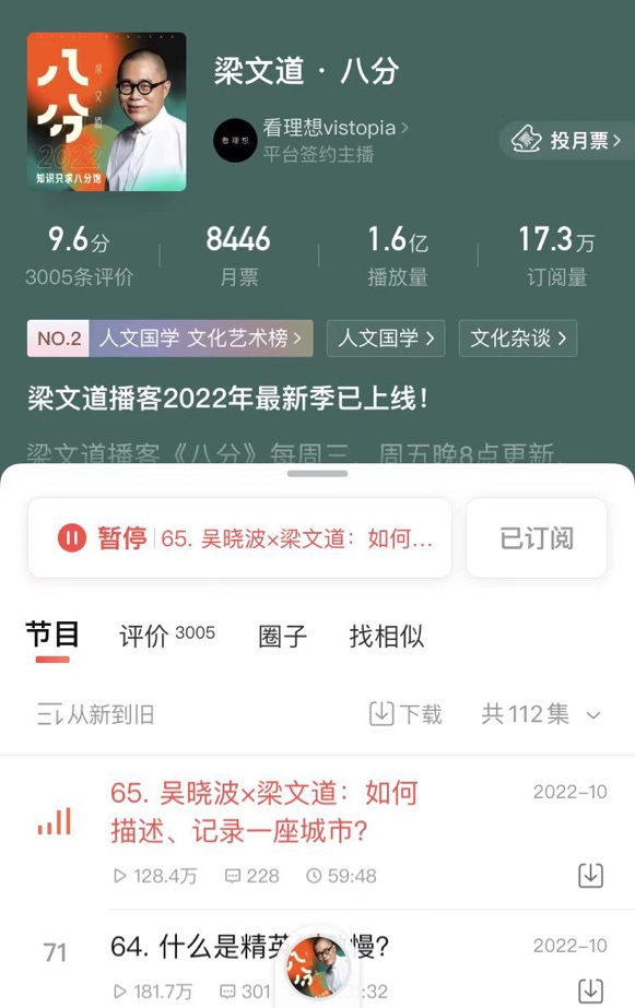 梁文道在喜马拉雅的播客节目《八分》则以阅读为起点,开放更多梁文道的精神私货,每周三、周五晚上陪伴听友,从当下出发,从理想回到现实。他在播客中邀请作家、艺术家、学者做客对话,每场对谈都有思想的光亮,让人感受到交流的乐趣与放松,并重新审视生活中的文化现象、热点话题。