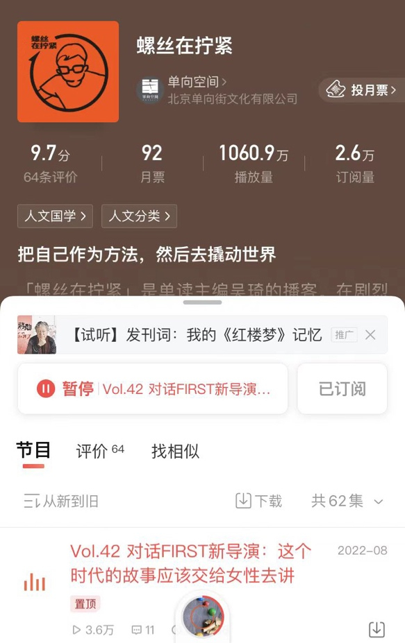 播客节目《螺丝在拧紧》的播客主吴琦是单读主编,他在播客中与不同领域的年轻人对话,以独立的洞察,创造新的文化空气,同时他还邀请亲密好友聊天,分享一手的生命经验,共同寻找未来的希望,以及更宽松、正直、值得一过的生活。《螺丝在拧紧》会触及生活中普遍存在现象讨论,犀利的观点打开听友新的视野,缓解听友围绕相关问题上的焦虑心情。