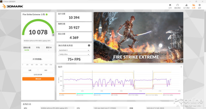 使用3DMark对显卡的性能进行测试,FireStrikeExtreme主要考验显卡在2K画质下DX11的性能,显卡分数为10394。