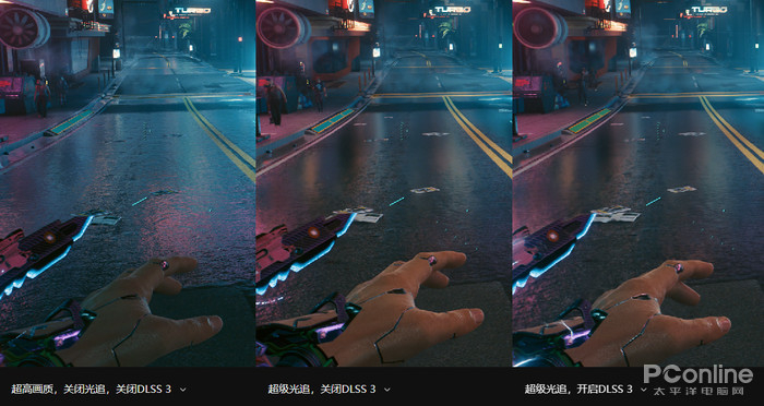 《赛博朋克2077》是光追游戏的代表作之一,同时也是相当吃配置的一款游戏。相比于光栅化渲染,光线追踪可以模拟出真实物理世界关于物体表面交互的全部自然现象。这也使得开启光追后,游戏中的环境更加贴近现实,让玩家能感受到更加逼真的体验。下图是在关闭光追、关闭DLSS和开启光追、开启DLSS3的对比。