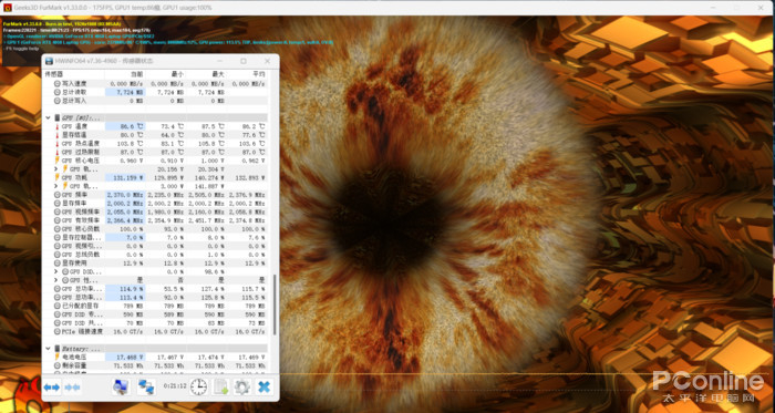 使用Furmark进行压力测试,可以看到RTX4050笔记本电脑GPU在七彩虹将星X15AT中可获得超过130W的稳定功耗输出,温度为86.6℃。