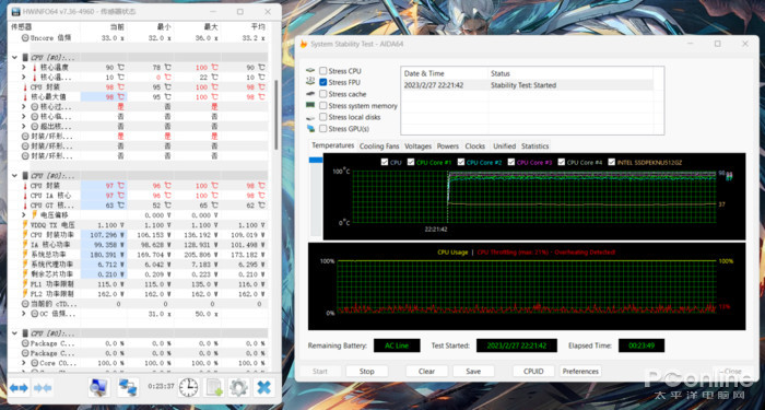 具体的性能释放方面,开启电脑性能控制中心的性能模式,并将风扇转速开到最大,使用AIDA64FPU进行单烤。在室温25℃的环境中运行20分钟后,七彩虹将星X15AT能让酷睿i7-13700HX稳定持续输出在近110W功耗,HWINFO显示CPU的封装温度为97℃、核心温度为97℃,整体表现不错。较高的功耗释放和稳定的温度控制,让酷睿i7-13700HX在后续测试中能展现出全部实力。