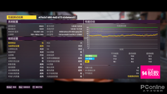 《极限竞速:地平线5》可以说是当下开放世界赛车游戏的巅峰之作,将分辨率设置为1920x1080,游戏画质设置为“超高画质”,关闭垂直同步。在官方提供的性能测试中,可以达到平均94FPS的综合帧数,流畅玩耍完全没有问题。