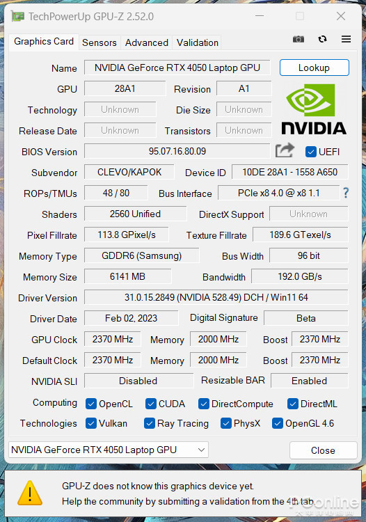 显卡方面,本次收到的七彩虹将星X15AT搭载了RTX4050笔记本电脑GUP,采用了AD107核心,具有2560个CUDA流处理器,6GBGDDR6容量显存,核心频率2370MHz,最大Boost频率2370MHz,目前因为GPU-Z最新版本还无法完全检索出RTX40系列笔记本电脑GPU规格,所以参数可能有误。